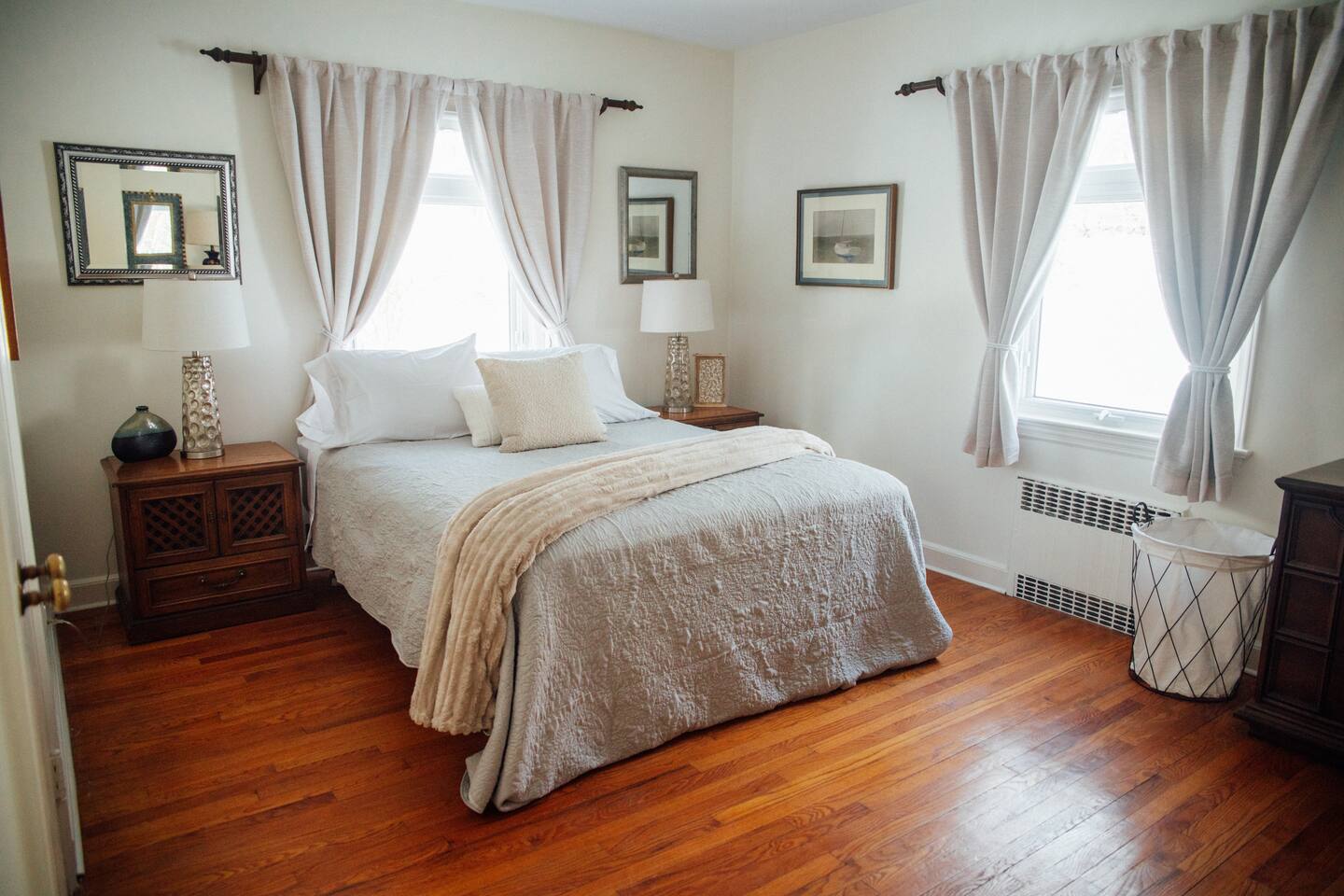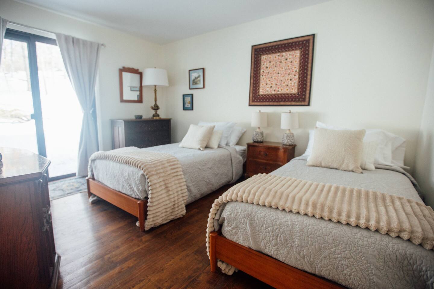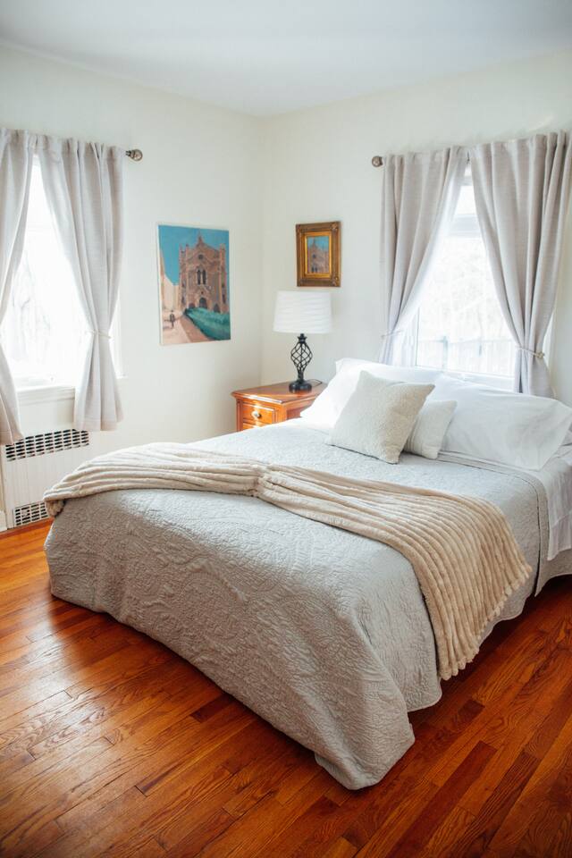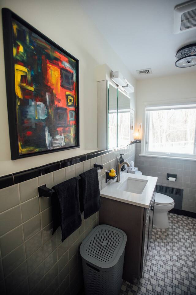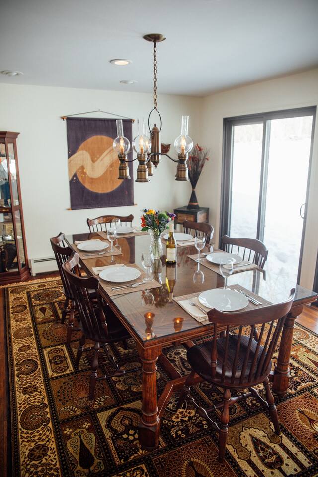 +Two bedrooms with Queen beds +One bedroom with two standard twin beds +one full bath with shower/tub, one 1/2 bath +Fully equipped kitchen (dishwasher, induction stove/oven, cookware, utensils, knives, coffee maker, bodum, glassware) +Full dining room +The property is in a wooded location; you will see wildlife. There are mosquitos, ticks and other bothersome critters - keep doors and screens closed :-)